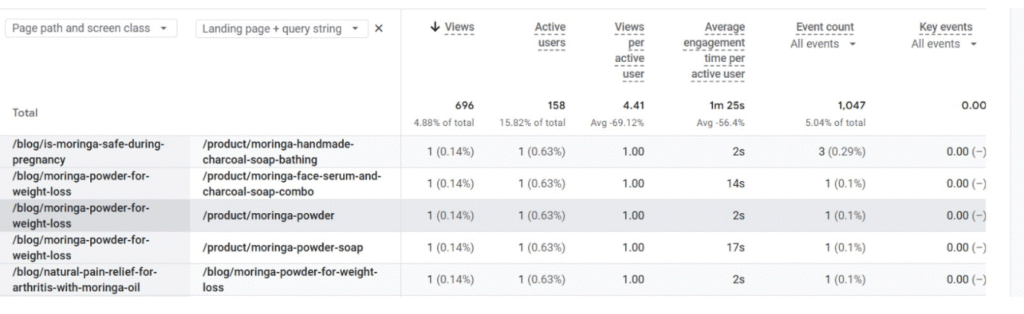 For example, for our client Doctor Moringa, we improved internal linking by connecting high-intent blog pages directly to relevant product pages, and as shown in the image, users started moving from blog articles to product URLs, indicating stronger internal link flow, better engagement, and improved conversion potential.