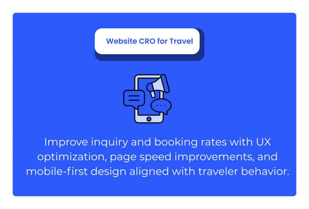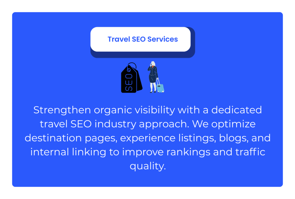 A professional travel marketing agency focuses on visibility at discovery stages, trust-building through content, and conversion optimization across websites and booking platforms, supported by SEO for travel industry to drive consistent demand in a highly competitive travel landscape.