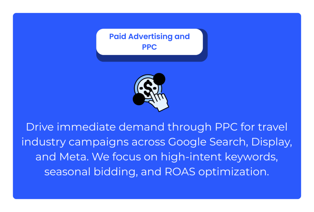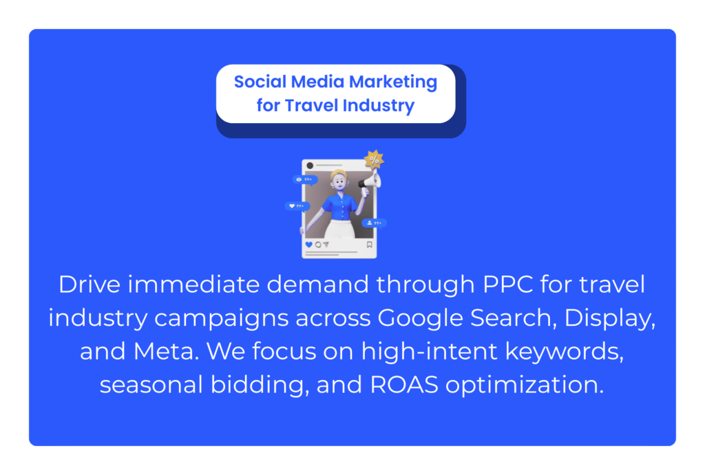 Successful travel industry marketing strategies require strong organic visibility, compelling storytelling, seasonal planning, and multi-channel attribution. SEO plays a major role in capturing destination-based searches, while PPC and social media help drive immediate bookings.