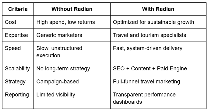 Travel brands need more than visibility. They need a growth system that compounds across seasons. With proven seo services for travel industry and performance-driven digital marketing for travel industry businesses, Radian helps you scale bookings, traffic, and long-term brand equity.