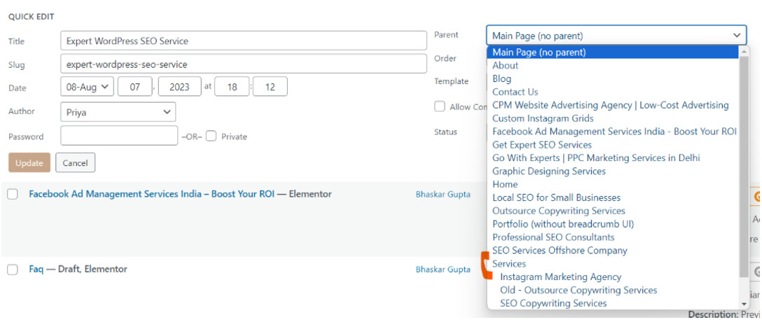 Step 4: Now, you want to add new pages under this subdirectory. You can add any existing page or create a new page to the subdirectory. For this, click on quick edit on that page and select the parent (or directory) under which you want your page to be.