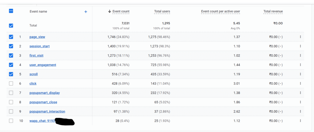 For example, you can track key events like page_view, session_start, scroll, click, demo-related interactions, and chat events across the last 30–60–90 days. If traffic events remain stable but intent-driven actions such as clicks, popup interactions, or chat initiations decline, it clearly shows how to diagnose a drop in leads for SaaS before revenue is impacted.