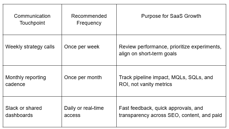 Most SaaS companies benefit from weekly strategy calls, monthly performance reporting, and real-time communication through Slack or shared dashboards. Consistent communication keeps agencies aligned with revenue goals.